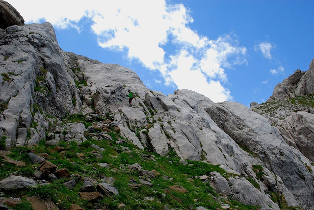 | Hemen gogortu da eremua. Azkenian, erdiko kanaleta marroitik igoko dugu. Eskuinean Ruzquia tontorra. |