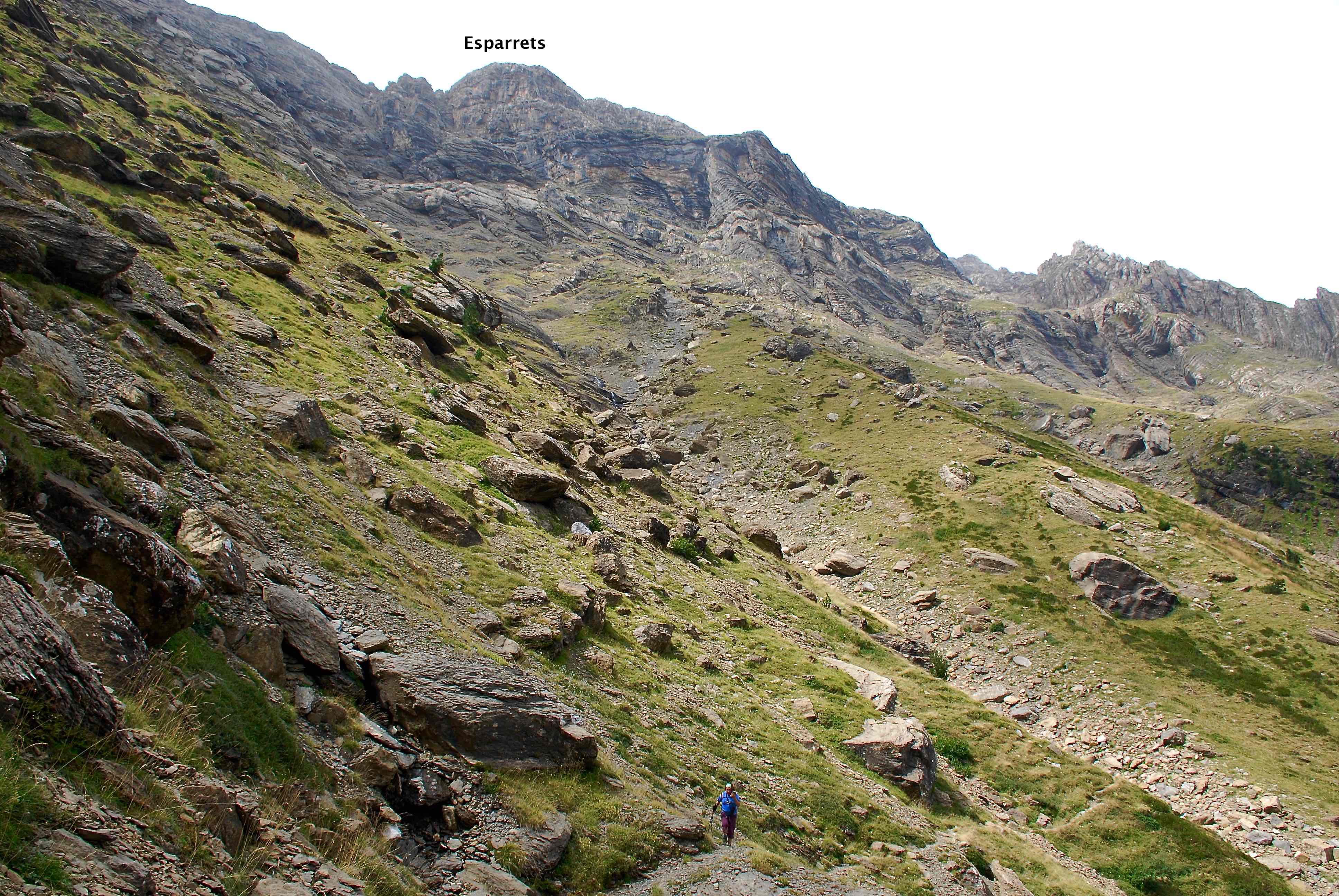 | Eta faxan asko gozatu ondoren, Añisclo lepotik behera datorren GR 11ra heldu gara. Hemen bukatzen da Tormosa faxa eta orain jetsiera bortitza geratzen zaigu aterpera. |
